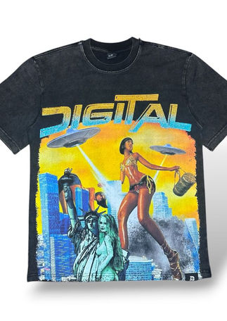 A cosmic collision of retro-futurism and streetwear. The DIGITAL SUNSET tee features an electrifying alien invasion scene with vibrant sunset hues, bold cityscapes, and a rhinestone-studded D on the back in radiant yellow-blue gradient. Designed for those who dress like they’re from another planet.