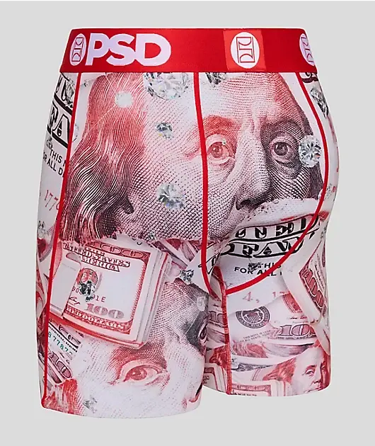 PSD introduces the new Hunneds boxer briefs in a red colorway. These boxers are designed with a non-roll or wear-down waistband, flatlock seams for itch-free comfort, and a micro-mesh pouch for breathability. The large PSD branding on the waistband adds a touch of flare to the overall design. The artwork features Benjamin Franklin with 100-dollar bills and diamonds, giving it a stylish and unique look.