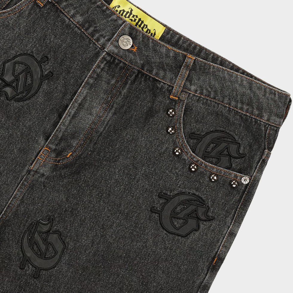 Constructed in premium denim with our GS logo stitched all over in vegan leather. Our denim provides a relaxed fit with our signature flare snap button/zip option at the bottom.
