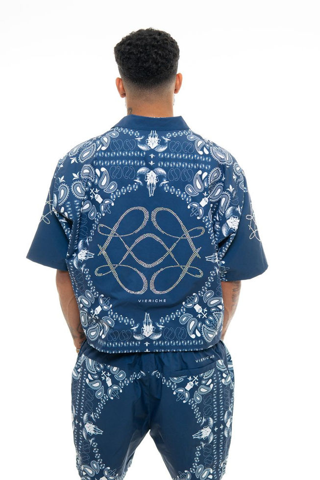 Two fits in one. This reversible set blends clean streetwear minimalism with loud paisley dominance. One side features a bold allover bandana pattern with rhinestone logo detailing front and back. Flip it, and you get a stripped-down navy base with printed logo hits and clean lines. Lightweight and breathable with a relaxed fit, this set lets you switch the energy anytime, anywhere.